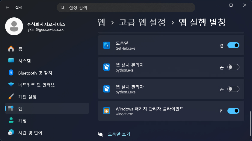 아래처럼 앱 실행 별칭에 있는 python 관련 항목을 끔으로 지정하면 됨.