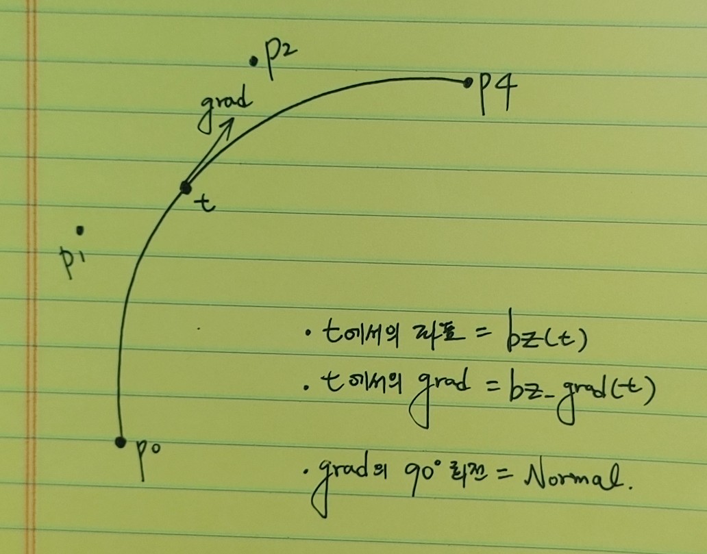 접선에 대한 벡터를 90도 회전하면 베지어의 법선 벡터를 구할 수 있다.