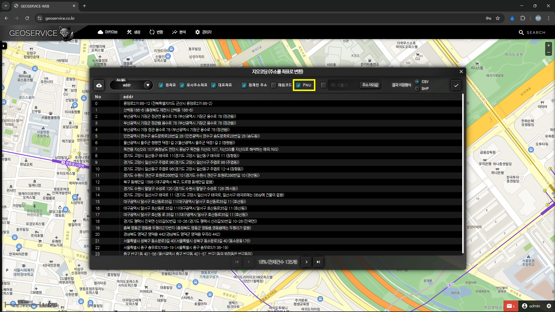 지오서비스웹에서 두번째로 가장 많이 사용되는 기능이 지오코딩입니다. 그간 받은 피드백 중 지오코딩 결과에 좌표 뿐만 아니라 PNU 코드가 필요하다는 이용자 분들이 계셨고 이에 대한 내용을 반영하였습니다.
