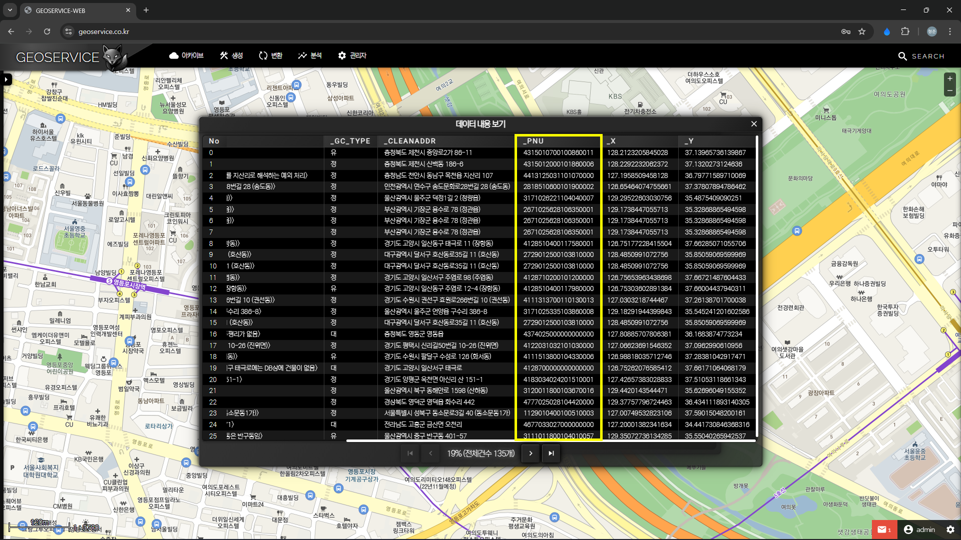 위의 내용처럼 설정하고 지오코딩을 실행한 결과를 들여다보면 다음처럼 _PNU라는 이름의 컬럼이 보이고 19자리의 코드값이 저장된 것을 확인할 수 있습니다.