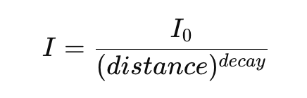 광원이 거리에 따라 얼마나 빨리 빛을 잃어버리는지를 결정하는 값인데요. 위 식에서 I는 거리에 따라 결정되는 실제 밝기값이고 I_0는 광원을 생성할때 지정한 밝기값이며, distance는 광원에서 물체까지의 거리입니다. decay는 우리가 살펴보고 있는 감쇠 계수입니다.