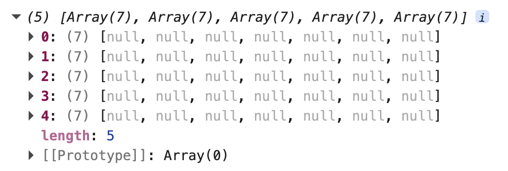 const x = 5; const y = 7; const cells = [...Array(x)].map(_ => [...Array(y)].map(_ => null)); console.log(cells);