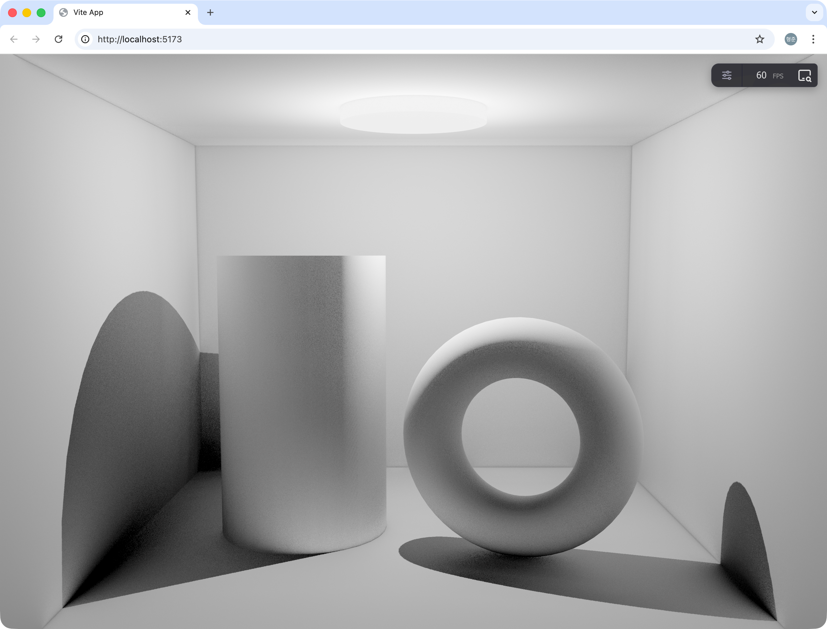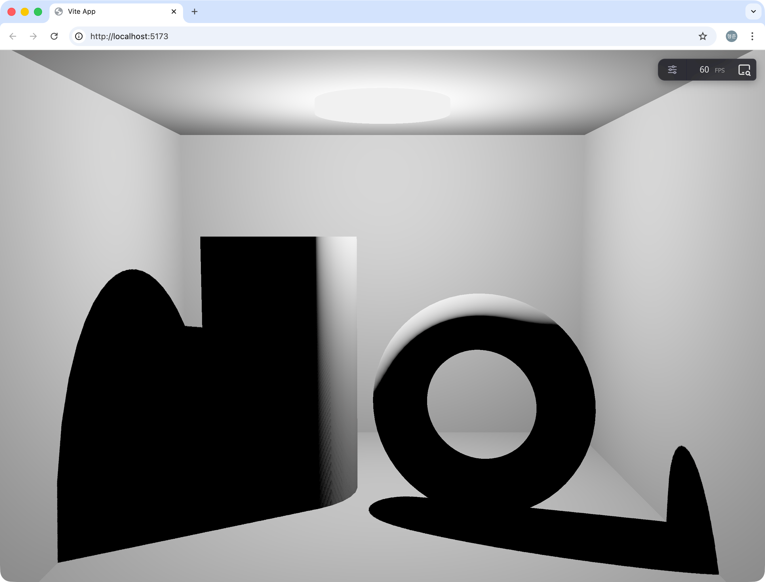 드디어 three.js의 WebGPU 지원이 매우 안정화되면서 GI(Global Illumination, 전역 조명) 기능을 사용할 수 있습니다. 꽤 오래전 babylon.js에서 GI 기능을 제공하지만 three.js는 그러지 못해 늘 안타까웠는데요. 먼저 GI란 3D 장면 내에서 빛이 광원에서 나와 물체에 직접 닿는 것(직접광)뿐만 아니라, 표면에 반사되고 산란되어 주변 환경을 밝히는 간접광(Indirect Lighting)까지 모두 계산하여 사실적인 조명 효과를 만들어내는 기술이라고 정의되어 있습니다. 네, 더 나은 장면을 만들어 주는 기술이라는 것입니다. 먼저 GI가 적용되지 않은 장면입니다. 광원은 PointLight 하나만 사용되었습니다.